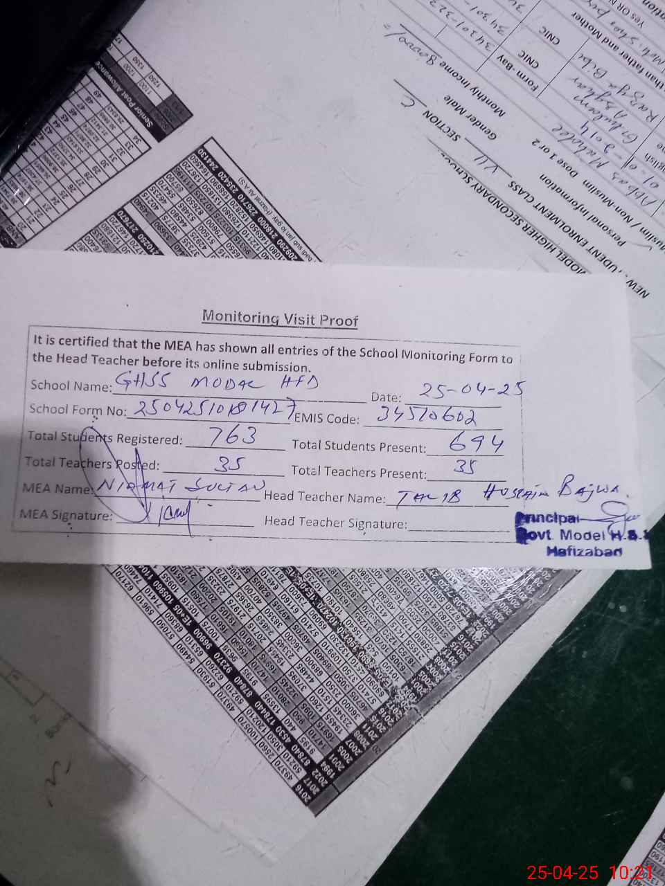 | Attendance Register | Head Teacher | MEA with School | Visit Proof |