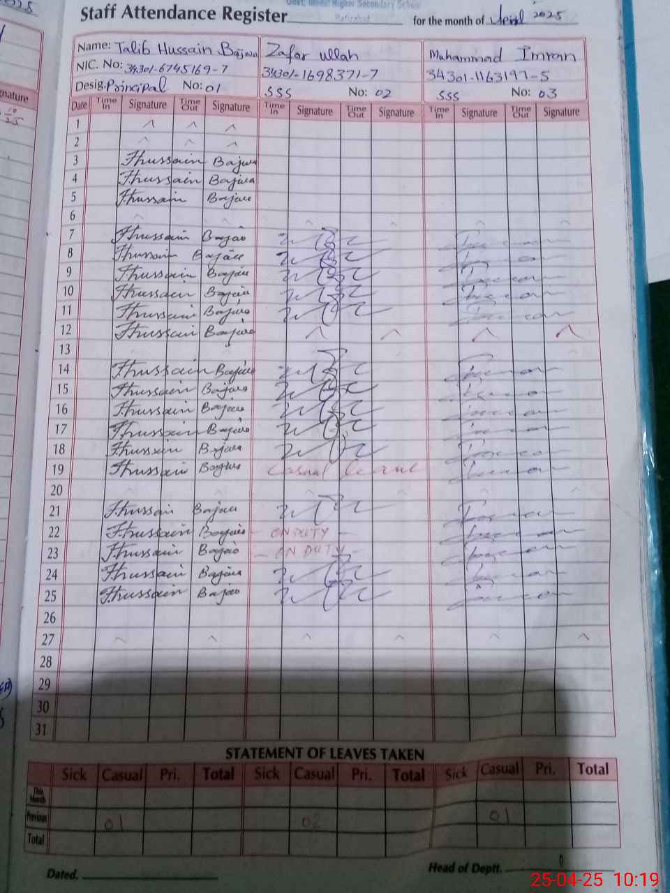 | CNIC | Full Name | Designation | R/C | Absence during last cal. month |