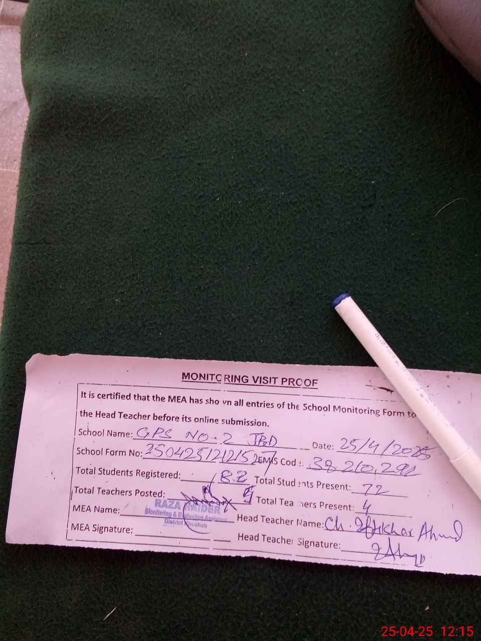 | Attendance Register | Head Teacher | MEA with School | Visit Proof |