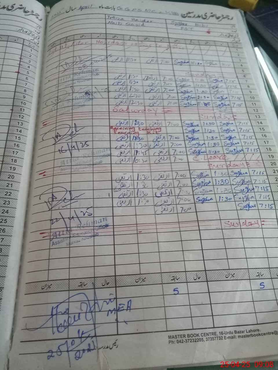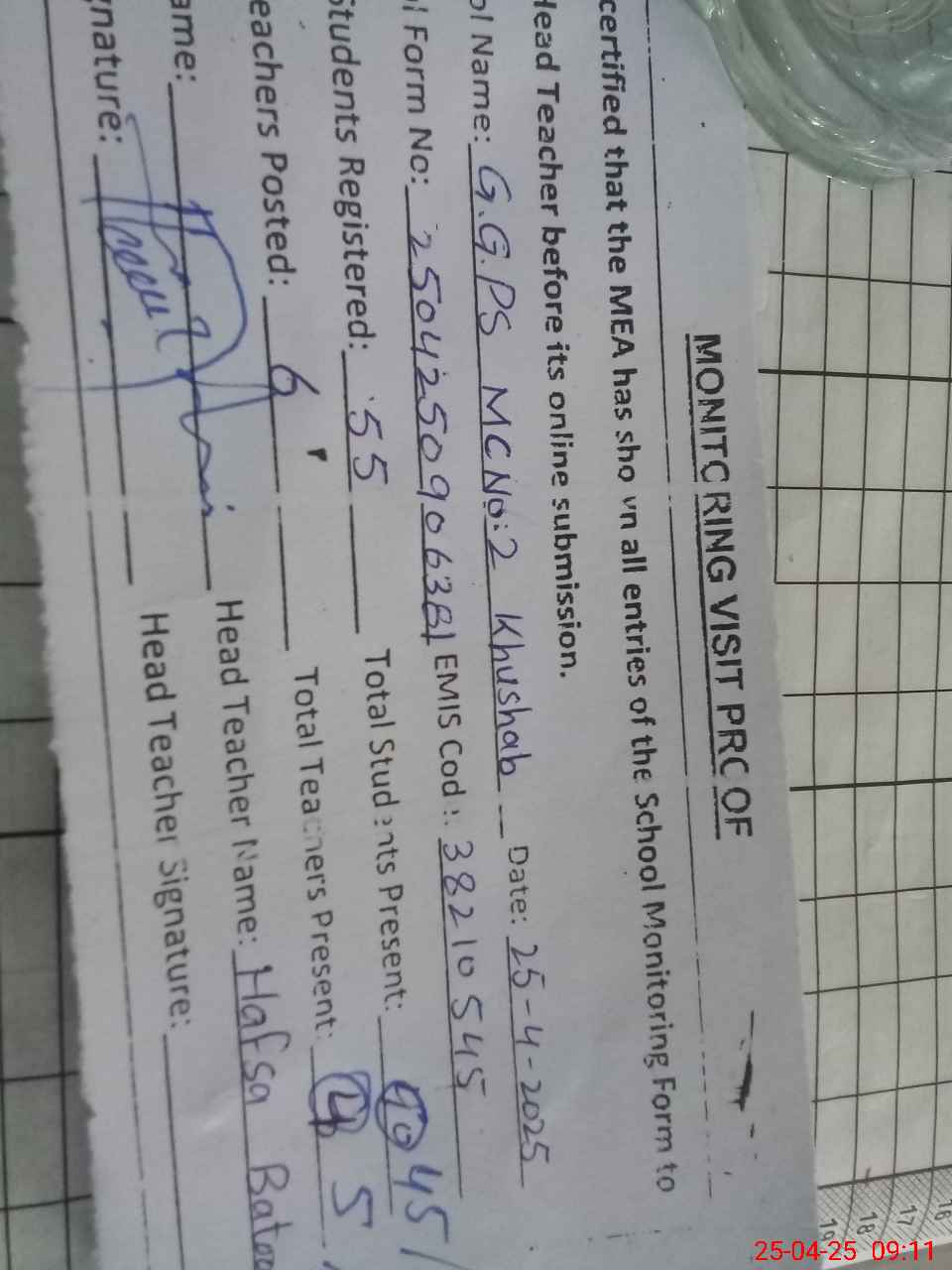 | Attendance Register | Head Teacher | MEA with School | Visit Proof |