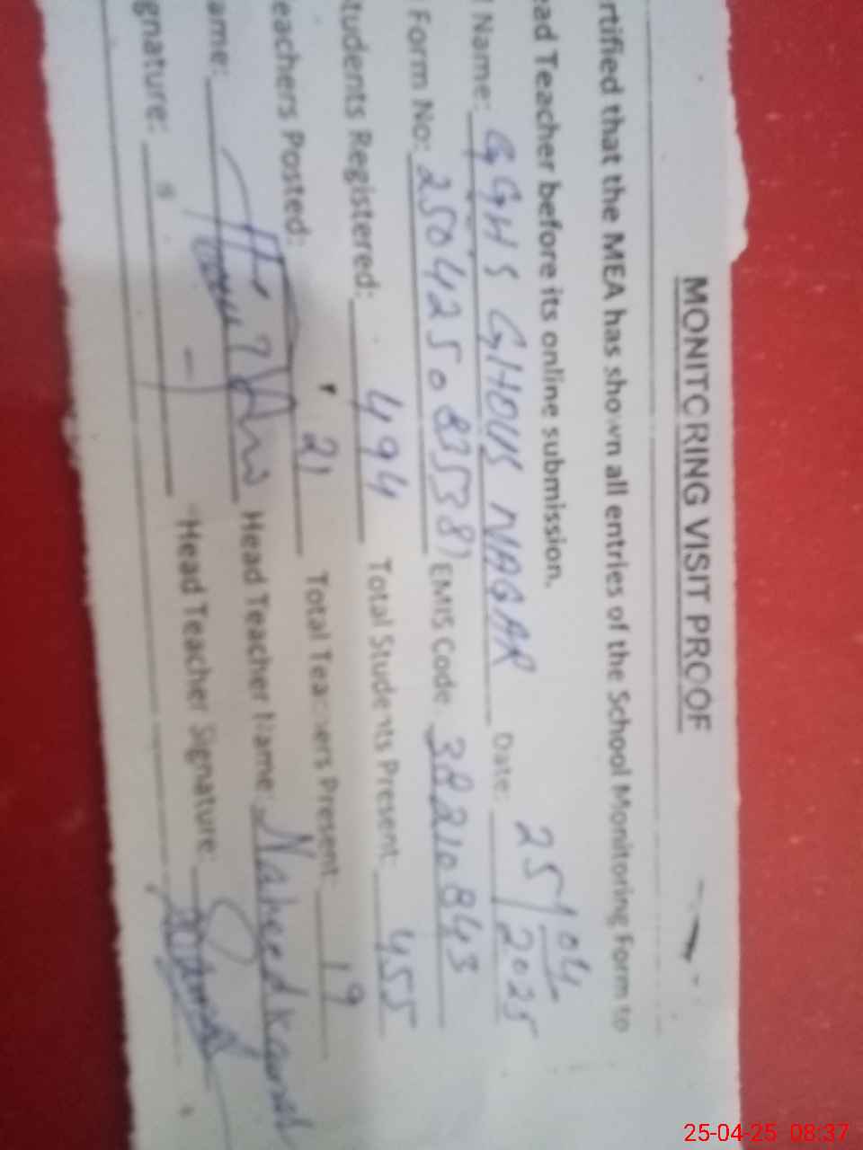 | Attendance Register | Head Teacher | MEA with School | Visit Proof |