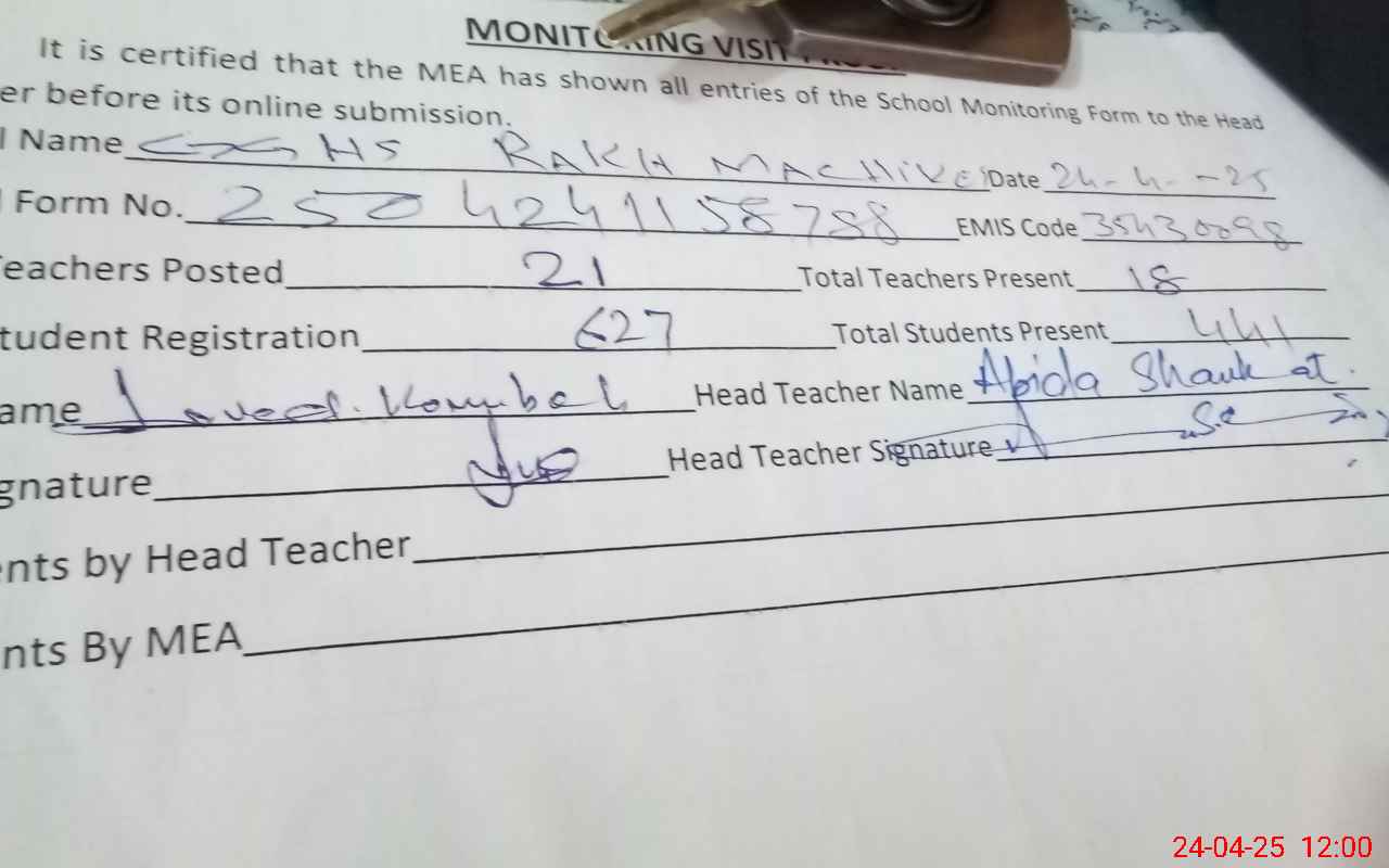 | Attendance Register | Head Teacher | MEA with School | Visit Proof |