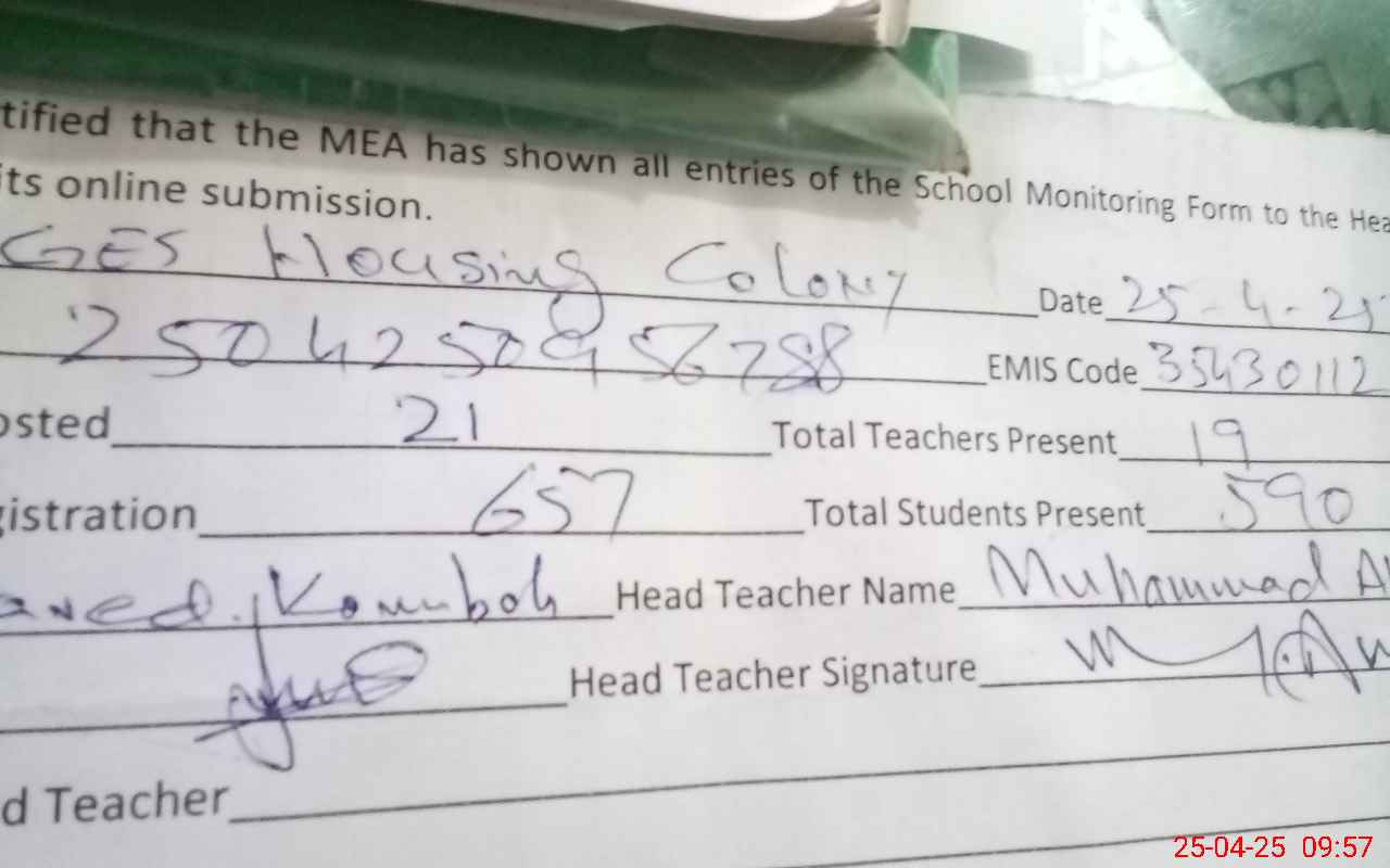 | Attendance Register | Head Teacher | MEA with School | Visit Proof |
