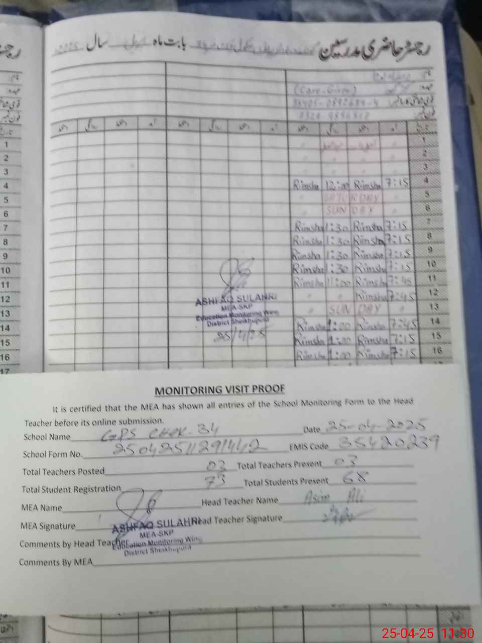 | Attendance Register | Head Teacher | MEA with School | Visit Proof |