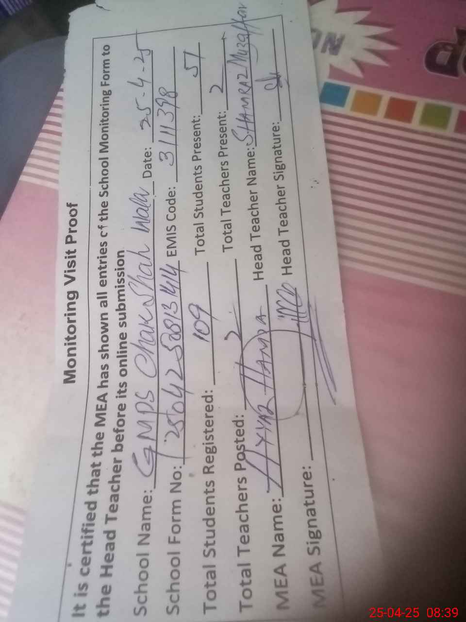 | EMIS Code: 31110398 | Name of School: GMPS CHAK SHAH WALA | |||