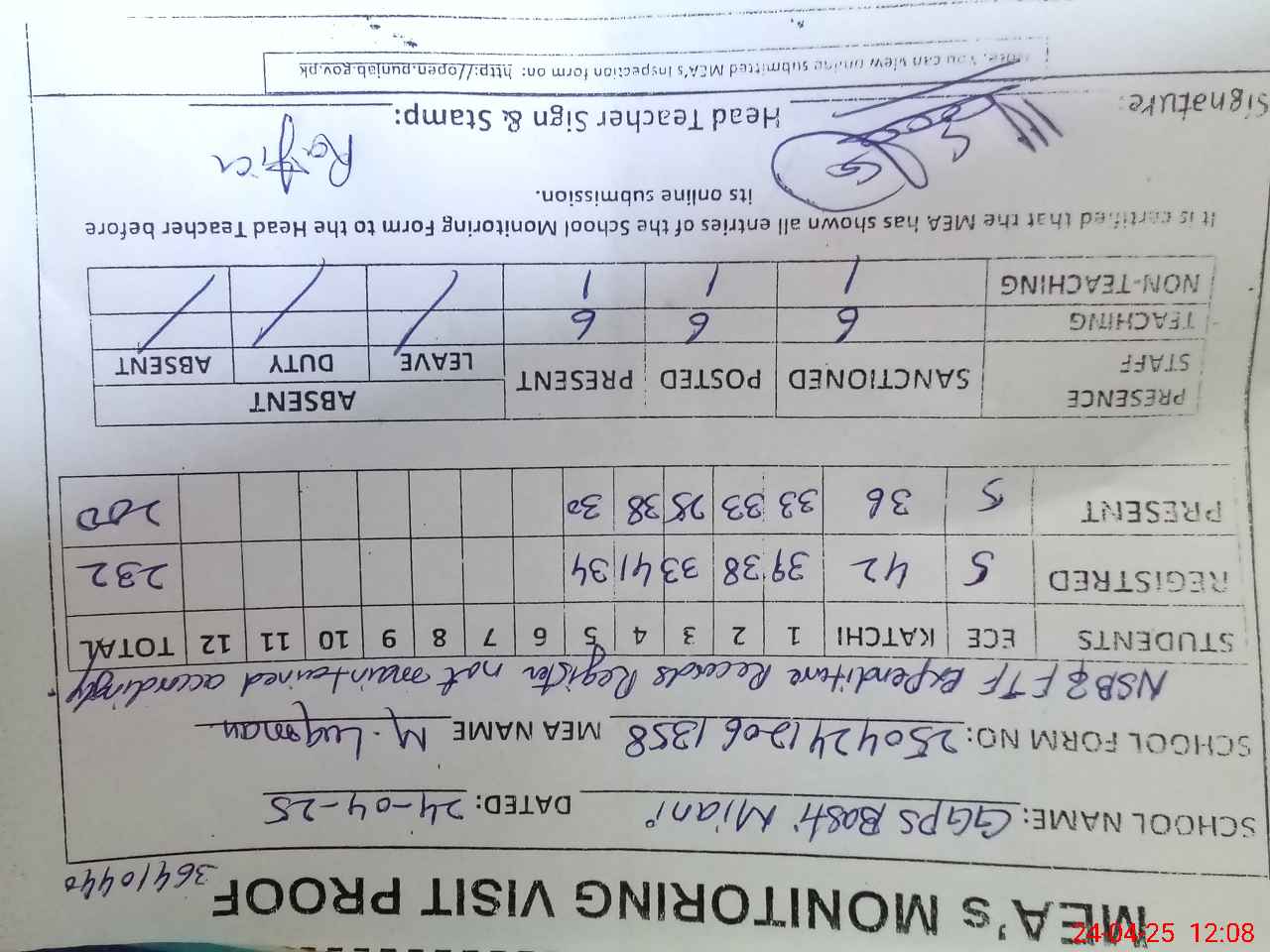 | Attendance Register | Head Teacher | MEA with School | Visit Proof |
