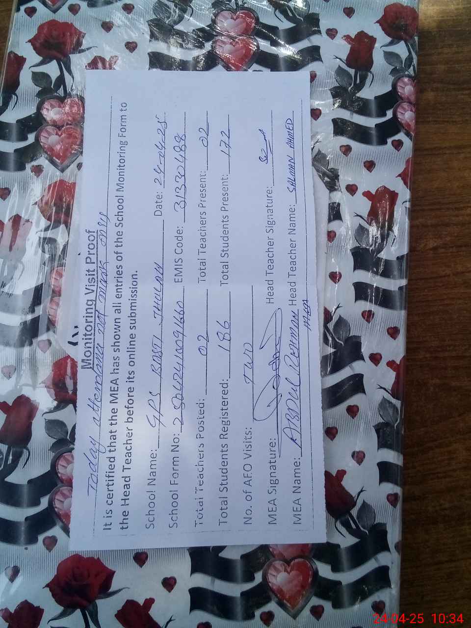 | Attendance Register | Head Teacher | MEA with School | Visit Proof |