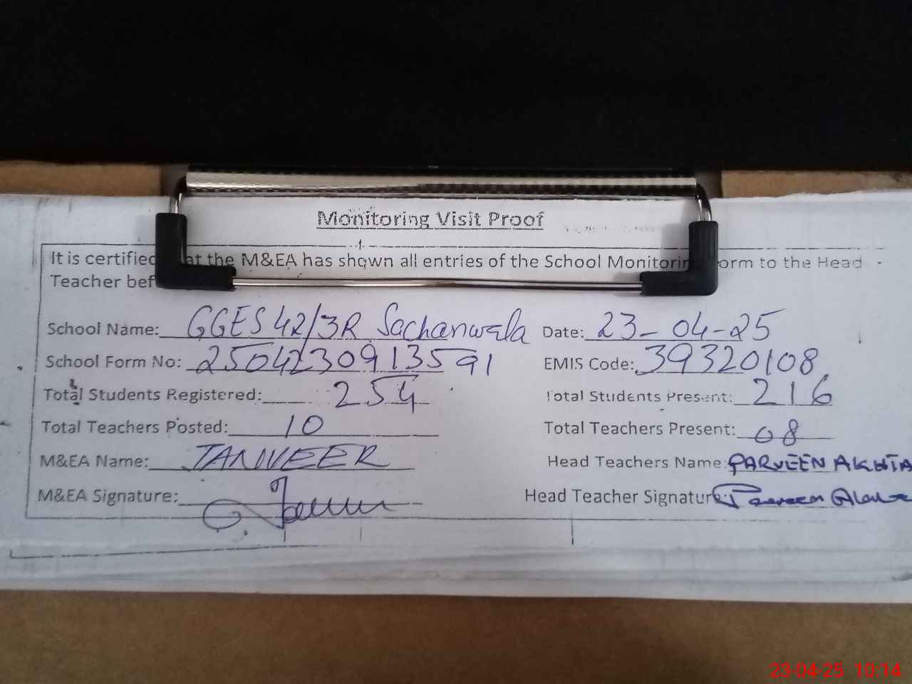 | EMIS Code: 39320108 | Name of School: GGES CHAK NO.42/3-R SACHAN WALA | |||