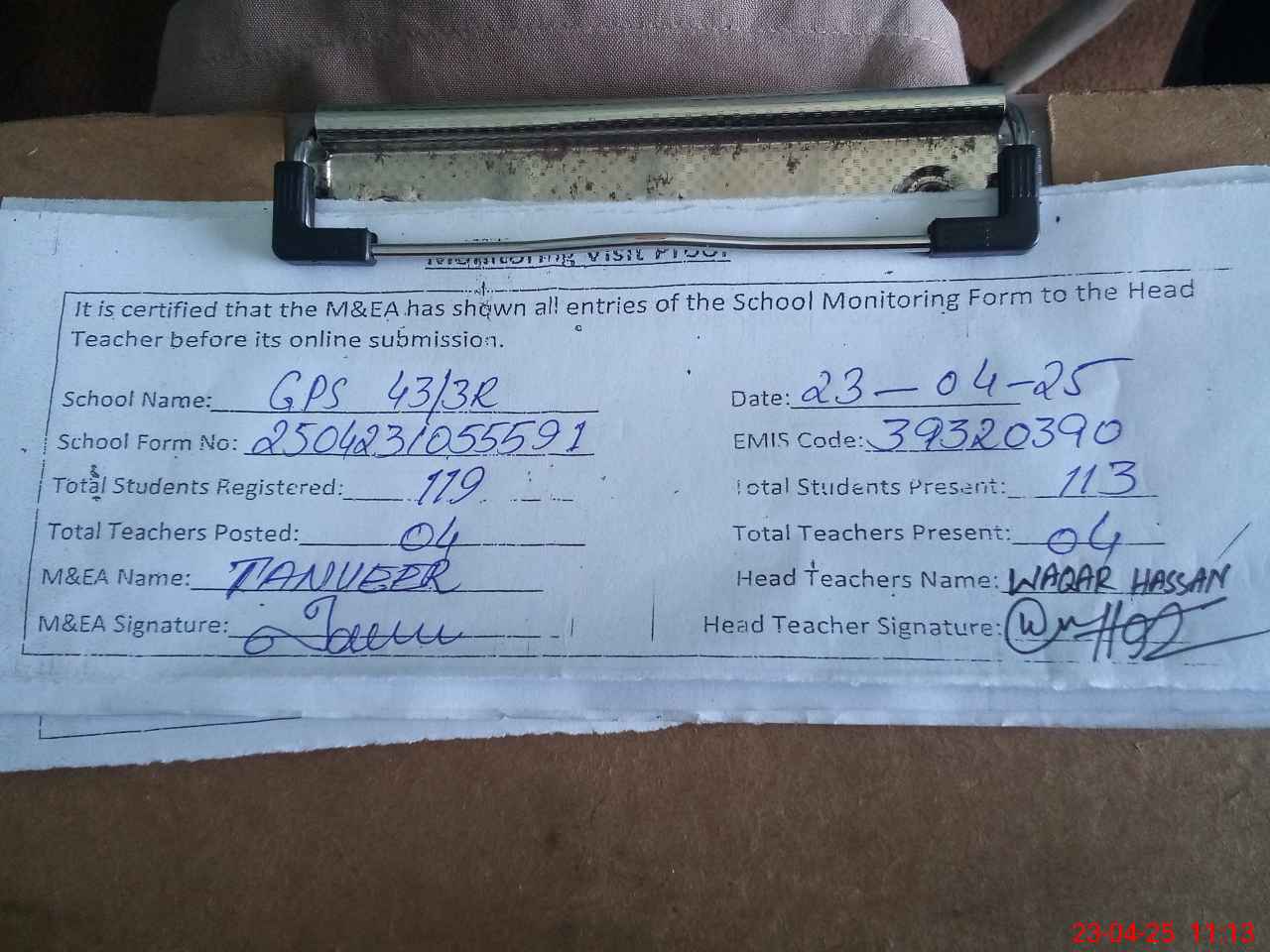 | Attendance Register | Head Teacher | MEA with School | Visit Proof |