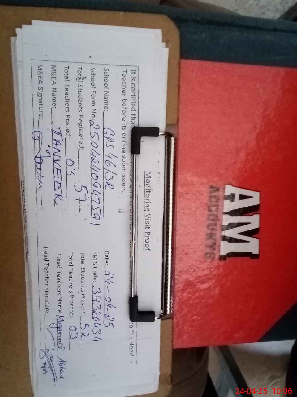 | Attendance Register | Head Teacher | MEA with School | Visit Proof |