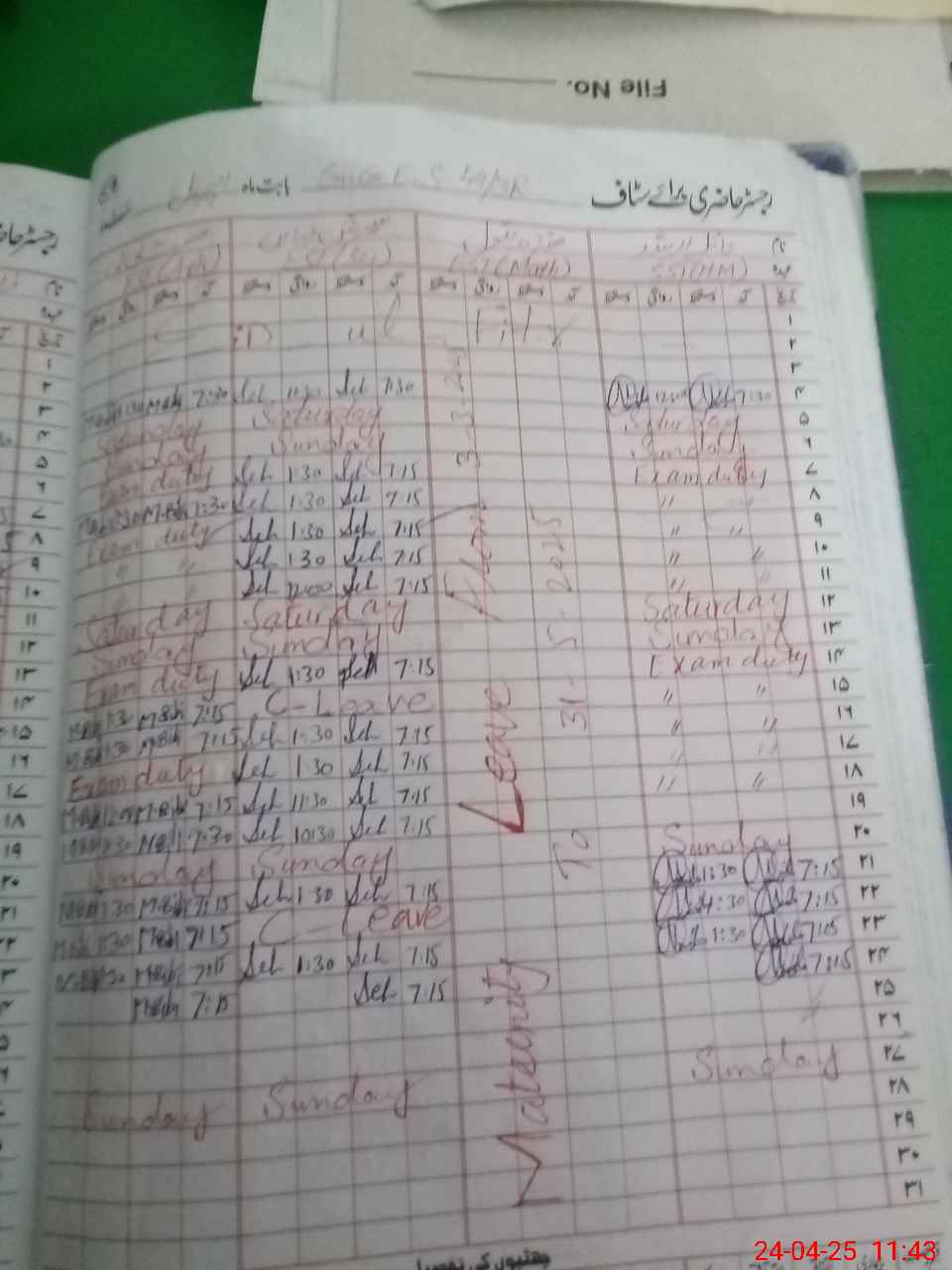 | Leave | Duty | Absent | Maternity | Medical | Ex- Pak |