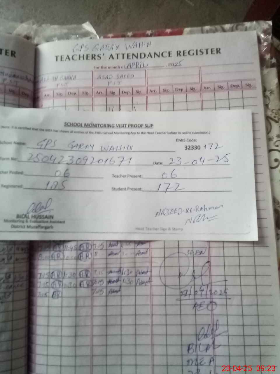| Attendance Register | Head Teacher | MEA with School | Visit Proof |