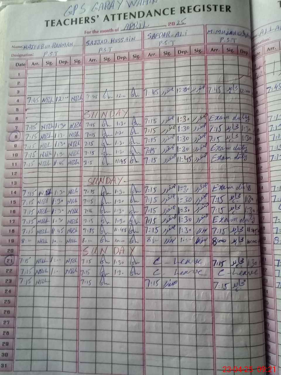 | CNIC | Full Name | Designation | R/C | Absence During Last Calender Month |