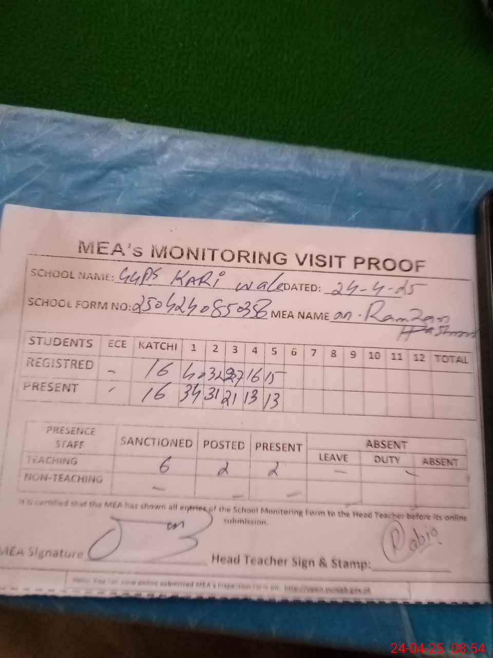 | Attendance Register | Head Teacher | MEA with School | Visit Proof |