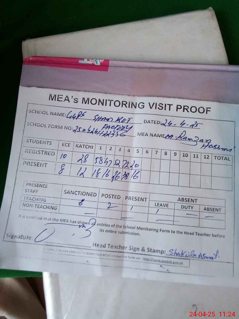 | EMIS Code: 36410397 | Name of School: GGPS SHAM KOT FACTORY, KABIRWALA | |||