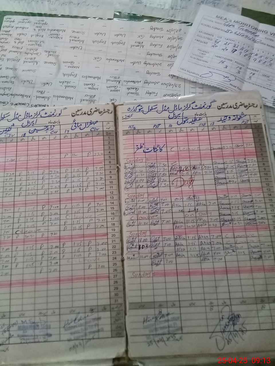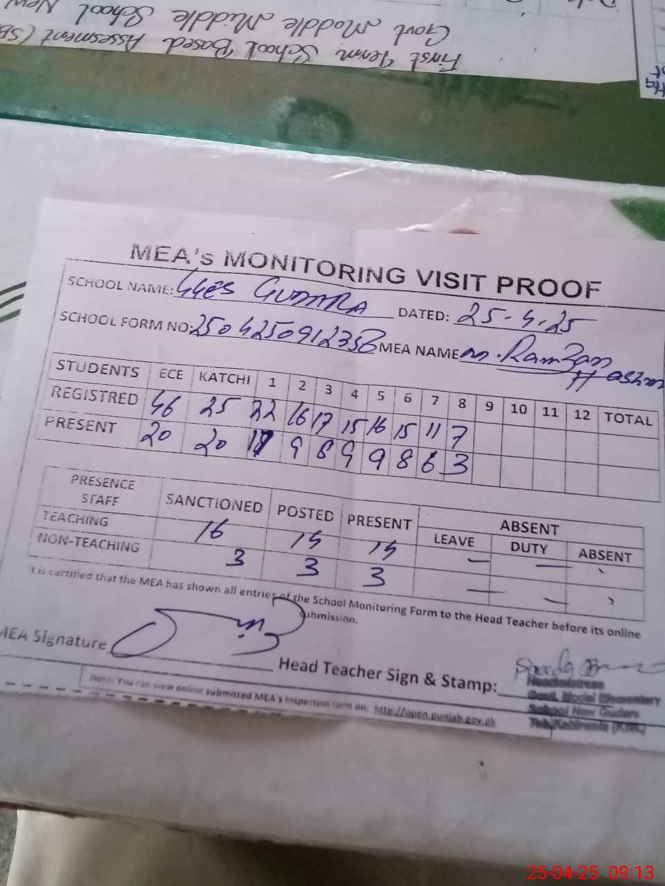 | Attendance Register | Head Teacher | MEA with School | Visit Proof |