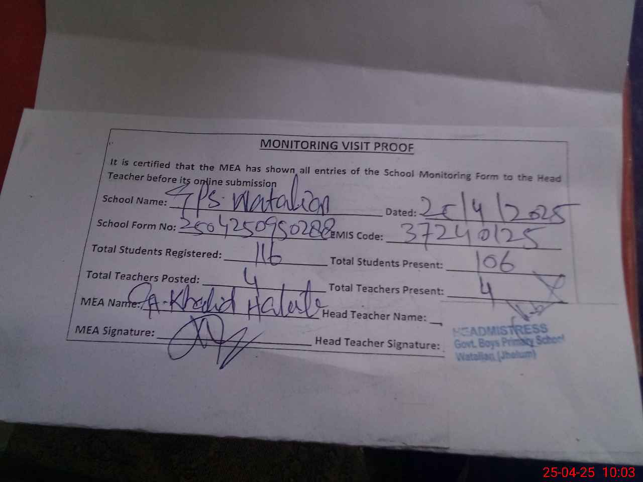 | Attendance Register | Head Teacher | MEA with School | Visit Proof |