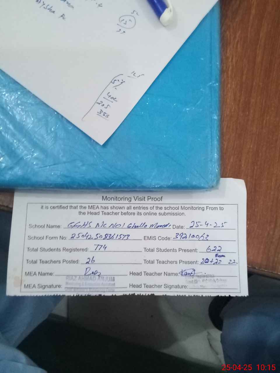 | Attendance Register | Head Teacher | MEA with School | Visit Proof |
