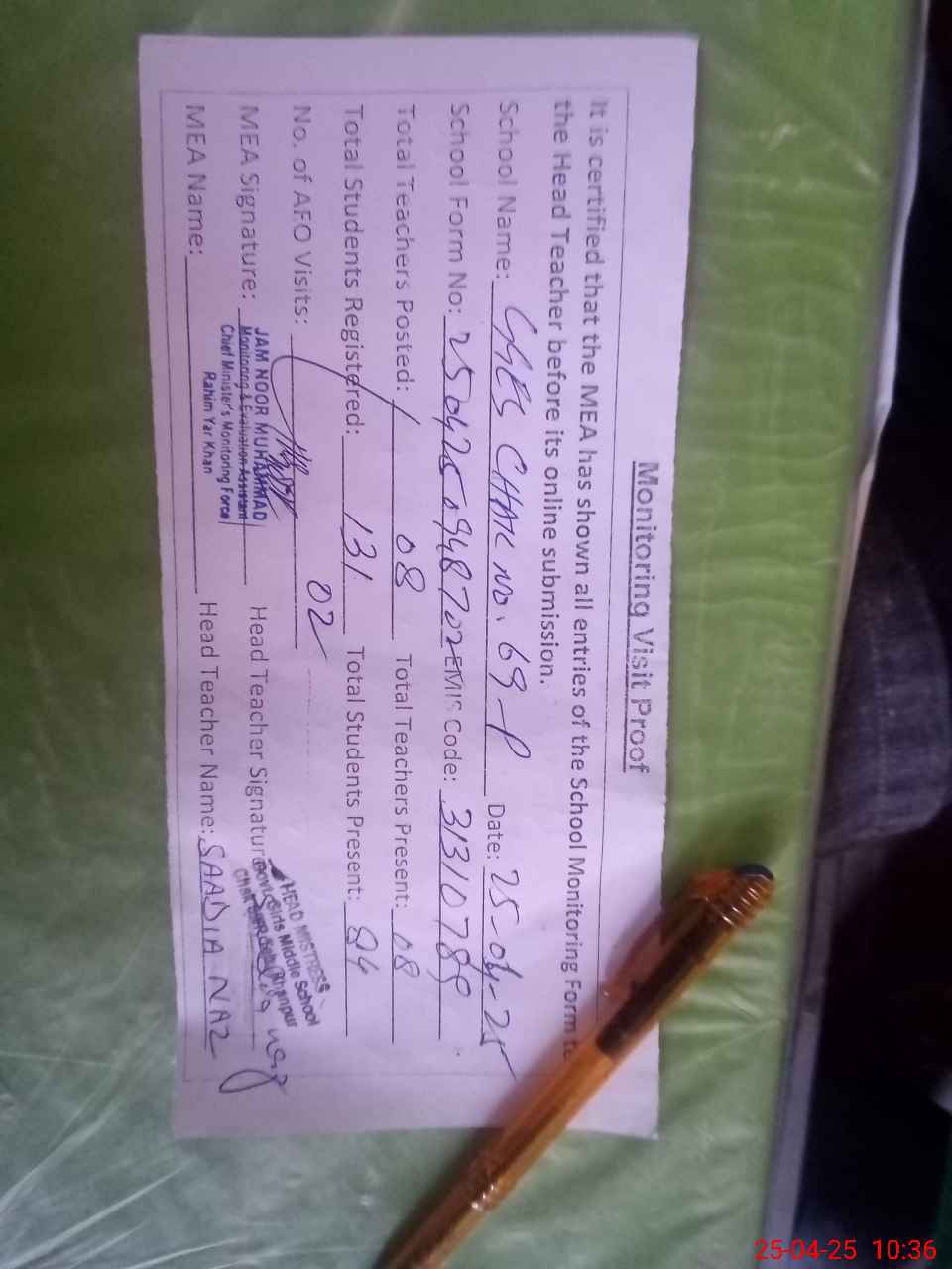 | Attendance Register | Head Teacher | MEA with School | Visit Proof |