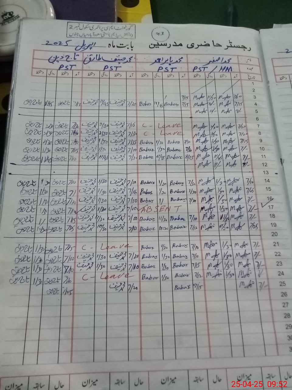 | CNIC | Full Name | Designation | R/C | Absence During Last Calender Month |