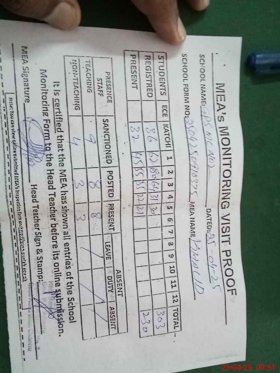 | Attendance Register | Head Teacher | MEA with School | Visit Proof |