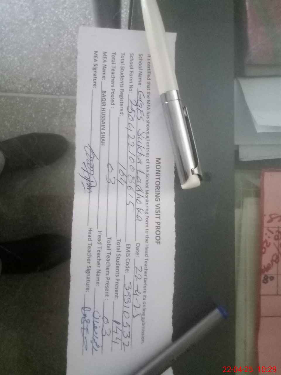 | Attendance Register | Head Teacher | MEA with School | Visit Proof |