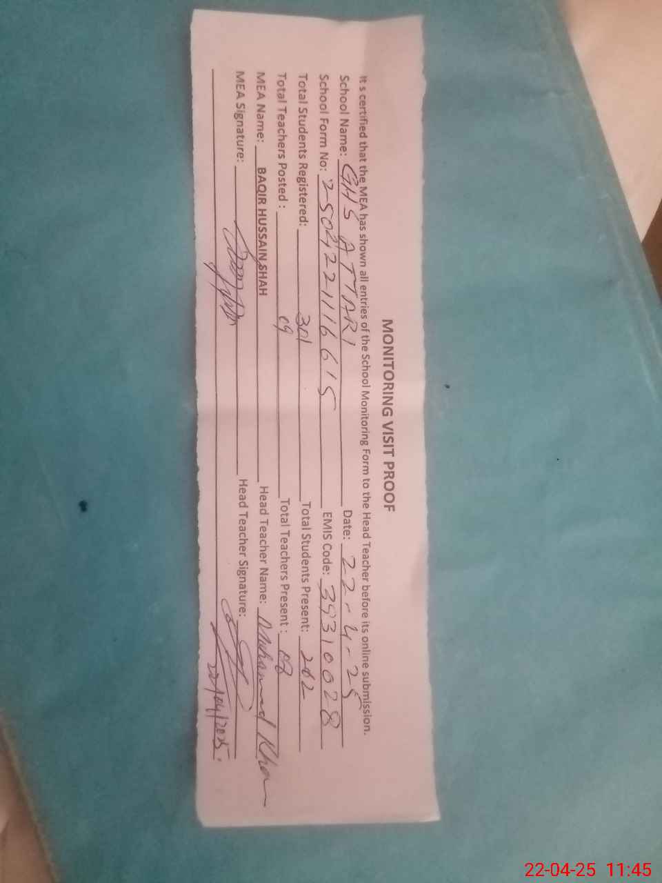 | Attendance Register | Head Teacher | MEA with School | Visit Proof |