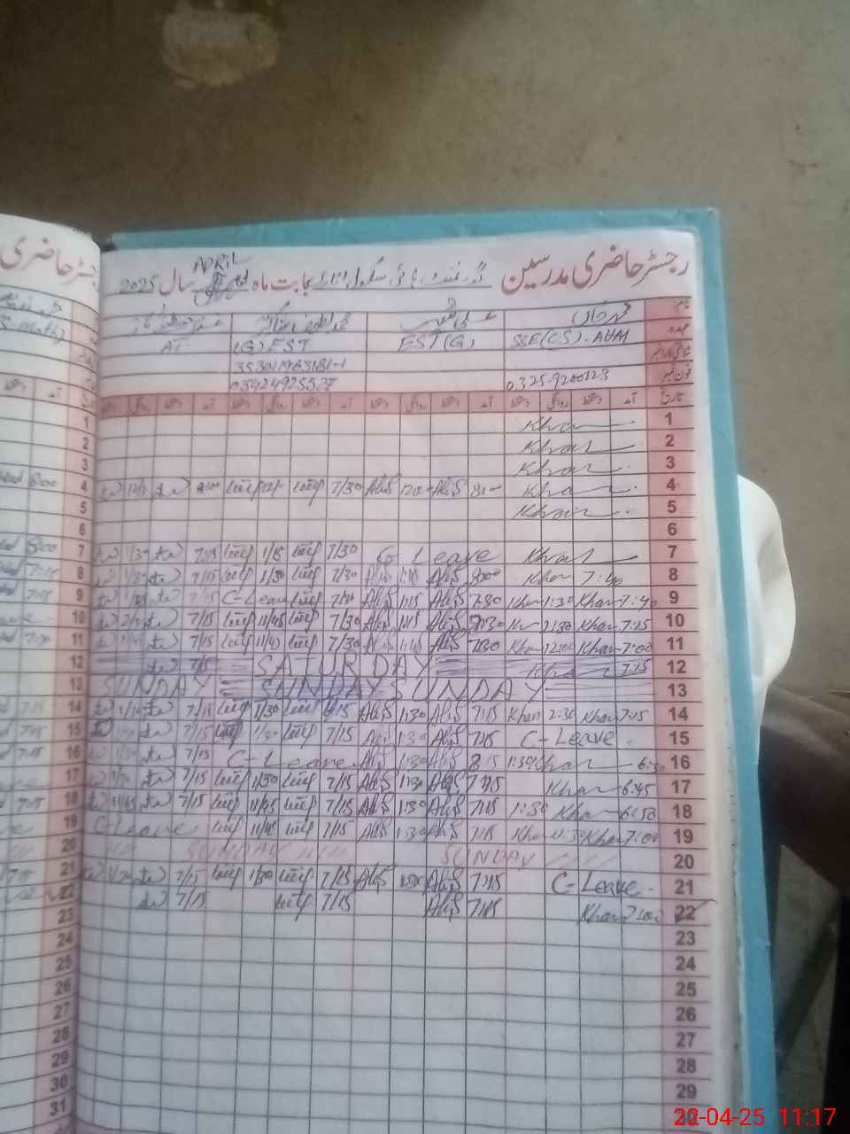 | CNIC | Full Name | Designation | R/C | Absence During Last Calender Month |