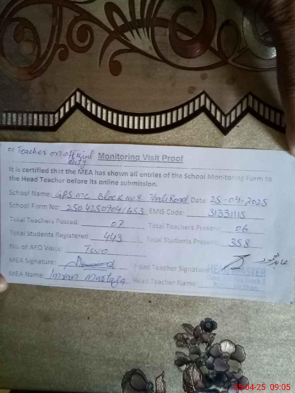 | Attendance Register | Head Teacher | MEA with School | Visit Proof |