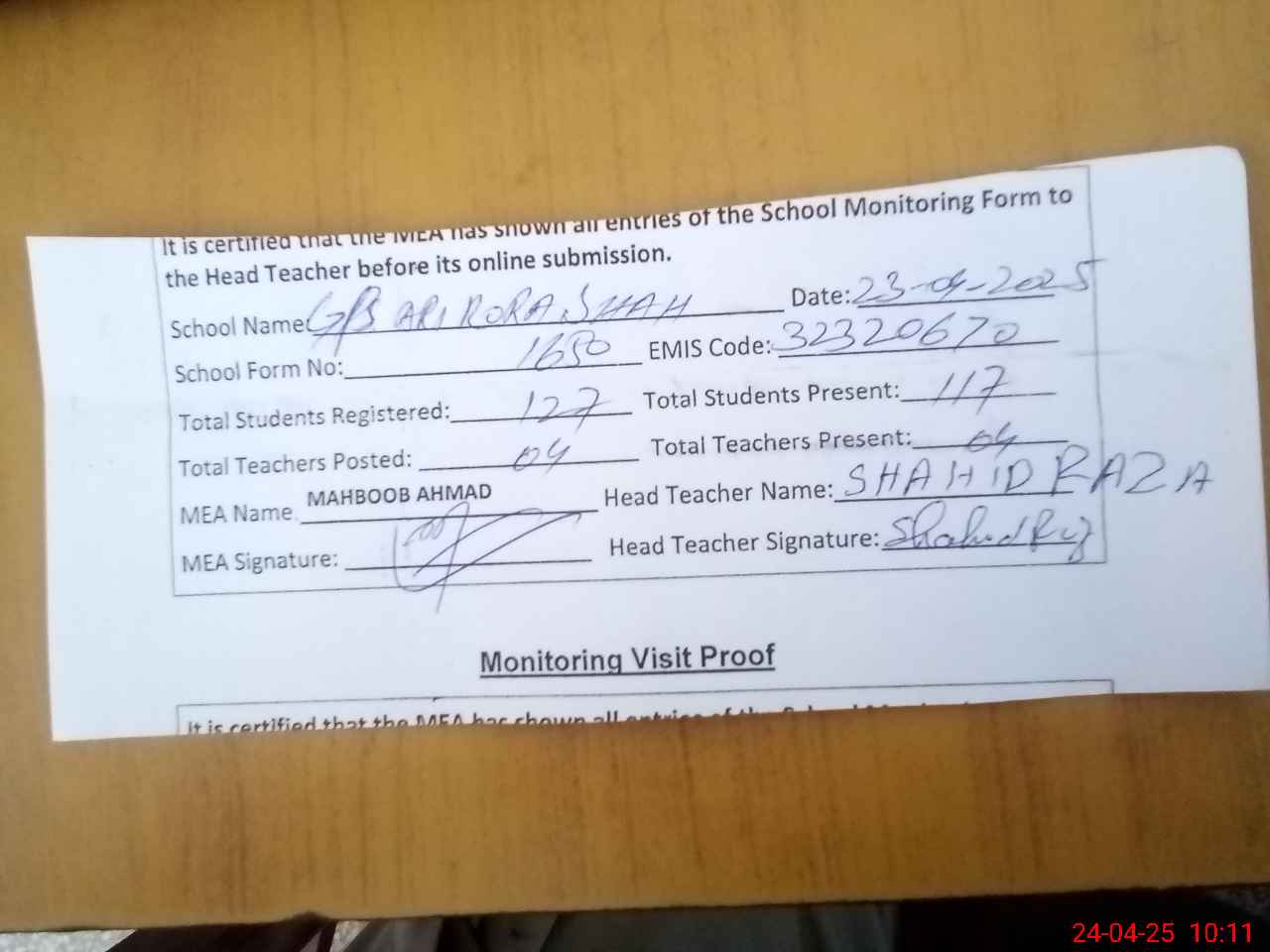 | Attendance Register | Head Teacher | MEA with School | Visit Proof |