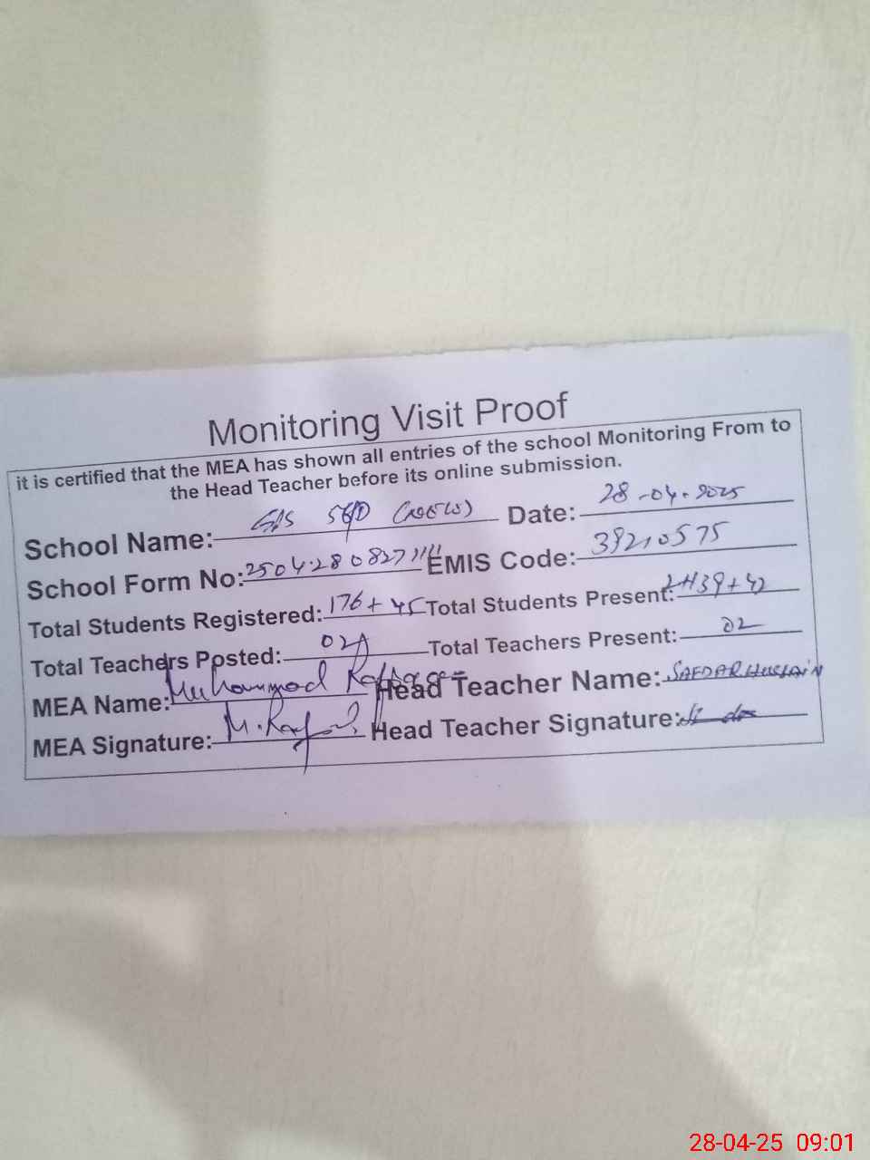 | Attendance Register | Head Teacher | MEA with School | Visit Proof |