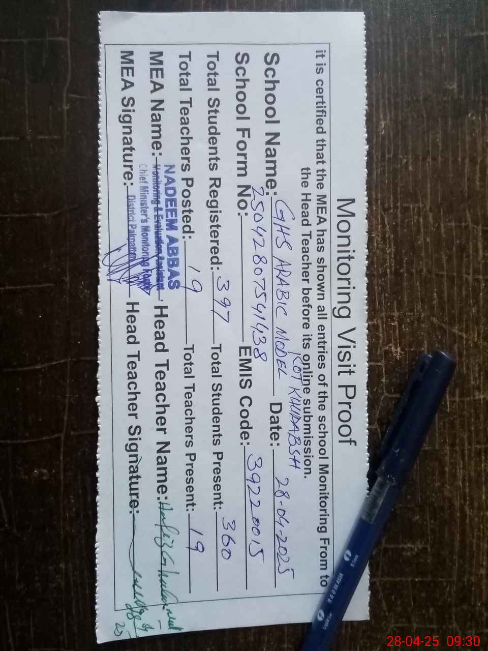 | Attendance Register | Head Teacher | MEA with School | Visit Proof |