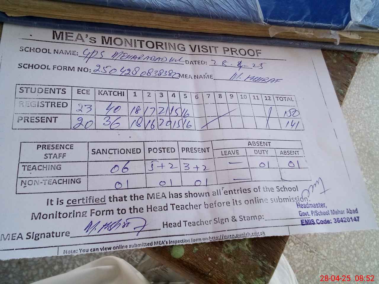 | Attendance Register | Head Teacher | MEA with School | Visit Proof |