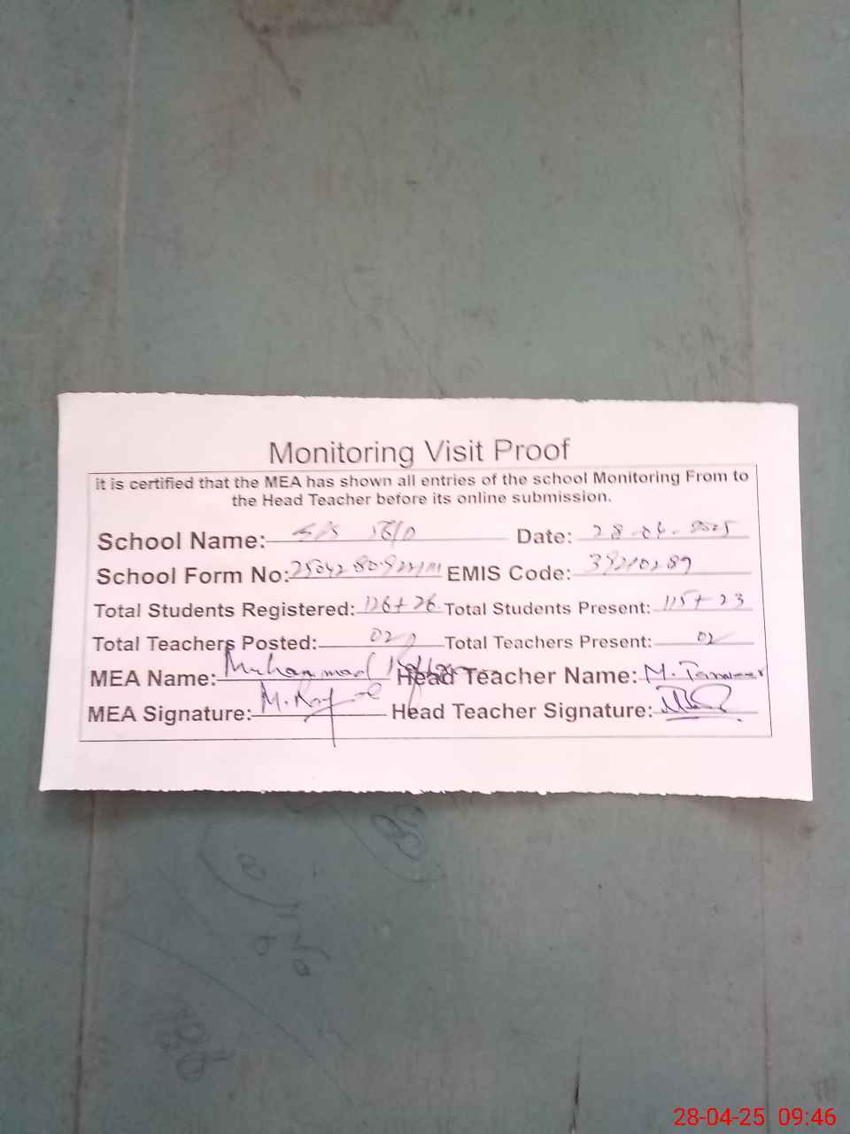 | Attendance Register | Head Teacher | MEA with School | Visit Proof |