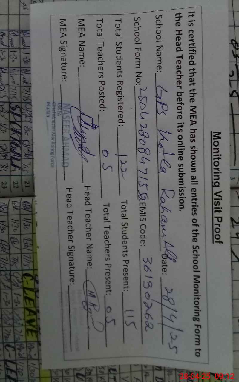| EMIS Code: 36130262 | Name of School: GPS KOTLA RAHAM ALI LAR MULTAN | |||