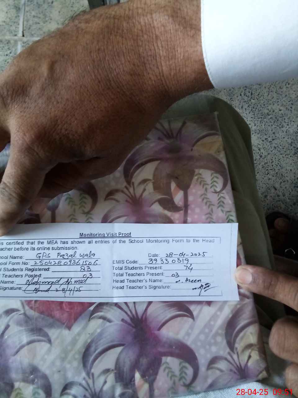 | Attendance Register | Head Teacher | MEA with School | Visit Proof |