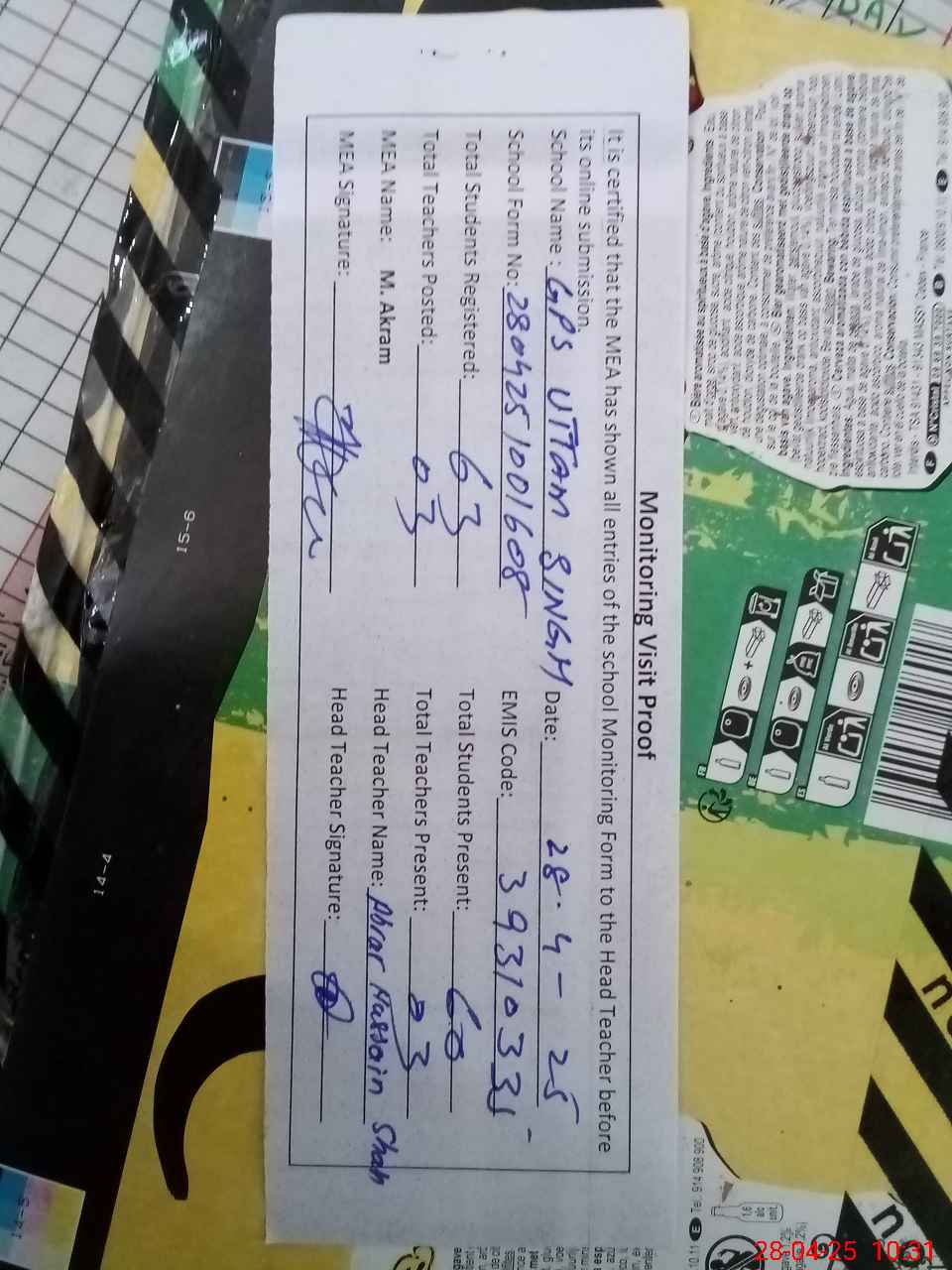 | Attendance Register | Head Teacher | MEA with School | Visit Proof |