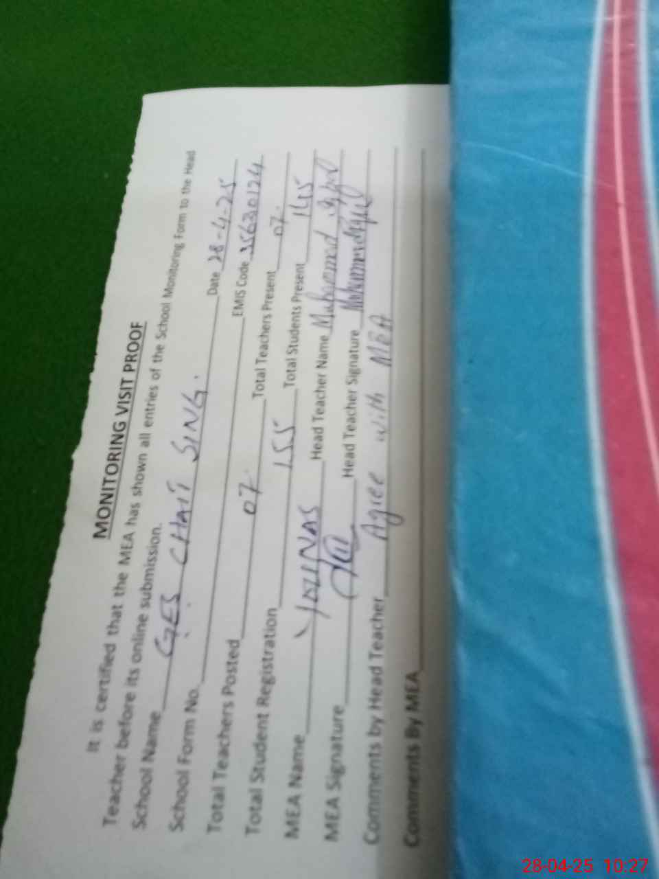 | Attendance Register | Head Teacher | MEA with School | Visit Proof |