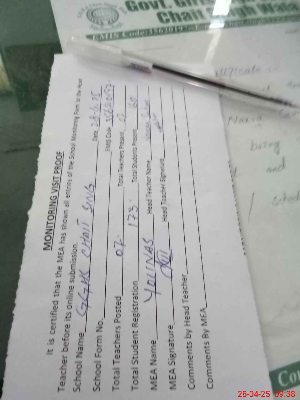 | Attendance Register | Head Teacher | MEA with School | Visit Proof |