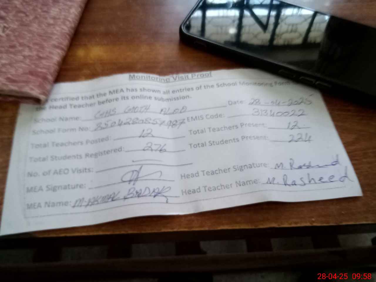 | Attendance Register | Head Teacher | MEA with School | Visit Proof |