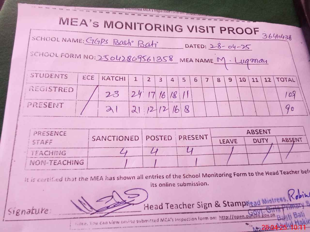 | Attendance Register | Head Teacher | MEA with School | Visit Proof |