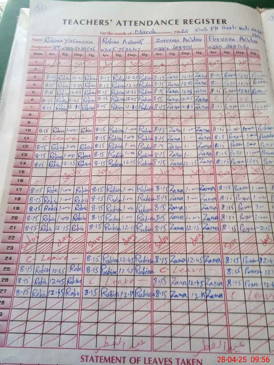 | CNIC | Full Name | Designation | R/C | Absence During Last Calender Month |