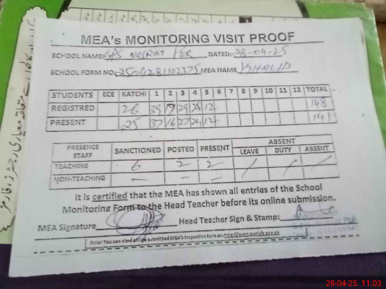 | Attendance Register | Head Teacher | MEA with School | Visit Proof |