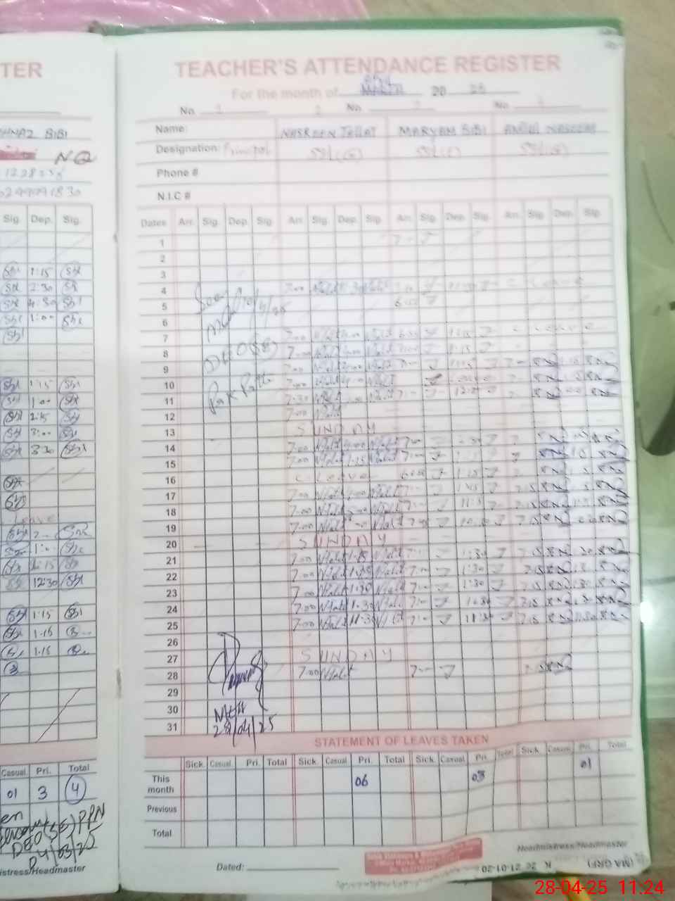 | CNIC | Full Name | Designation | R/C | Absence During Last Calender Month |
