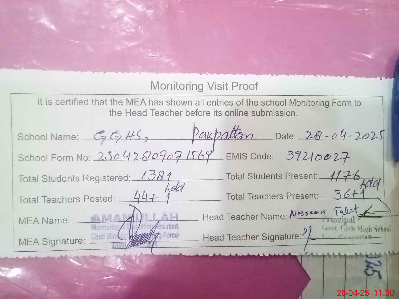 | EMIS Code: 39210027 | Name of School: GGHS PAKPATTAN | |||