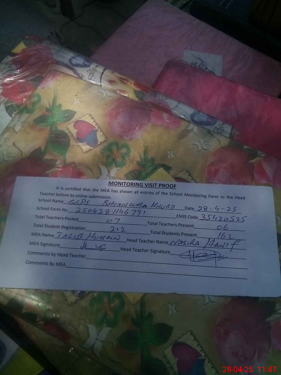 | Attendance Register | Head Teacher | MEA with School | Visit Proof |