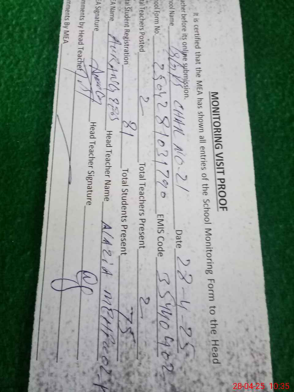 | Attendance Register | Head Teacher | MEA with School | Visit Proof |