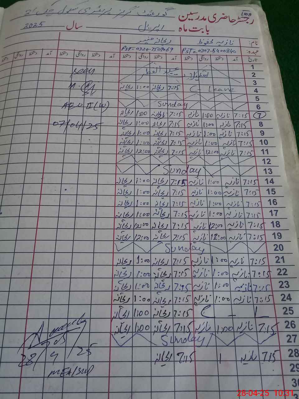 | CNIC | Full Name | Designation | R/C | Absence During Last Calender Month |