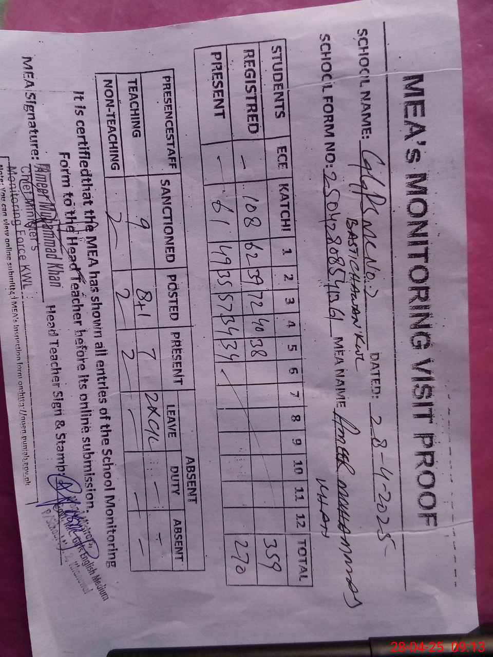 | Attendance Register | Head Teacher | MEA with School | Visit Proof |