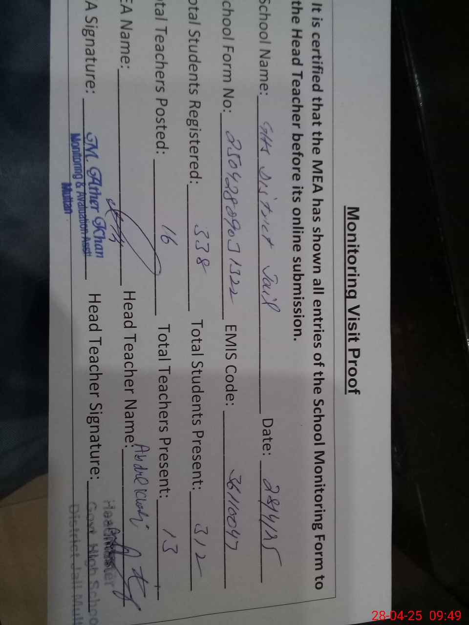 | EMIS Code: 36110047 | Name of School: GHS DISTRICT JAIL MULTAN | |||